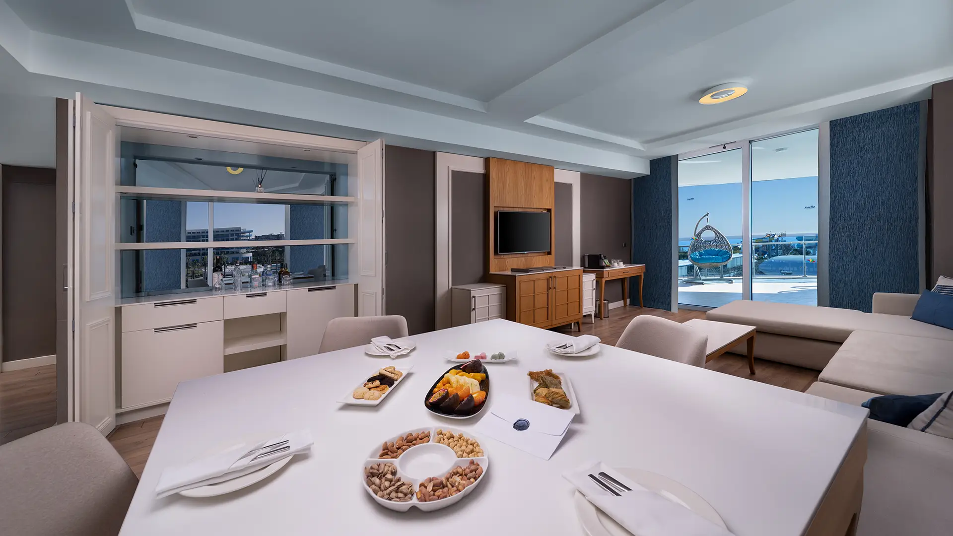 Unsere Superior Suite Exclusive Zimmer bieten mit ihrem makellosen Design, das mit feinem Geschmack dekoriert ist, zwei Schlafzimmern und einem Wohnzimmer einzigartige Privilegien für große Familien und Freundesgruppen. Mit einer Nutzfläche von 100 m² verfügen die Zimmer über einen geräumigen Wohnbereich mit einer sorgfältig ausgewählten Sitzgruppe sowie einem eleganten Esstisch und einem sorgfältig gestalteten Barbereich. Mit atemberaubenden Ausblicken auf das Mittelmeer verfügt der Balkon über einen Whirlpool, eine Sitzgruppe und Sonnenliegen zum Genießen der Sonne im Komfort Ihres Zimmers. Das Elternschlafzimmer mit einem geräumigen Bad bietet Ihnen alles, was Sie brauchen. Das zweite Schlafzimmer mit zwei separaten Betten bietet den komfortabelsten Urlaubserlebnis.
