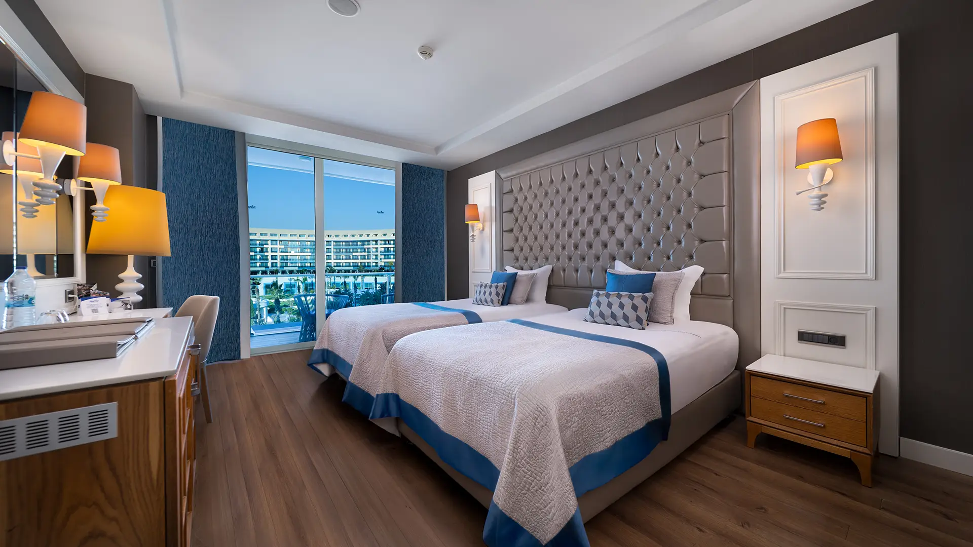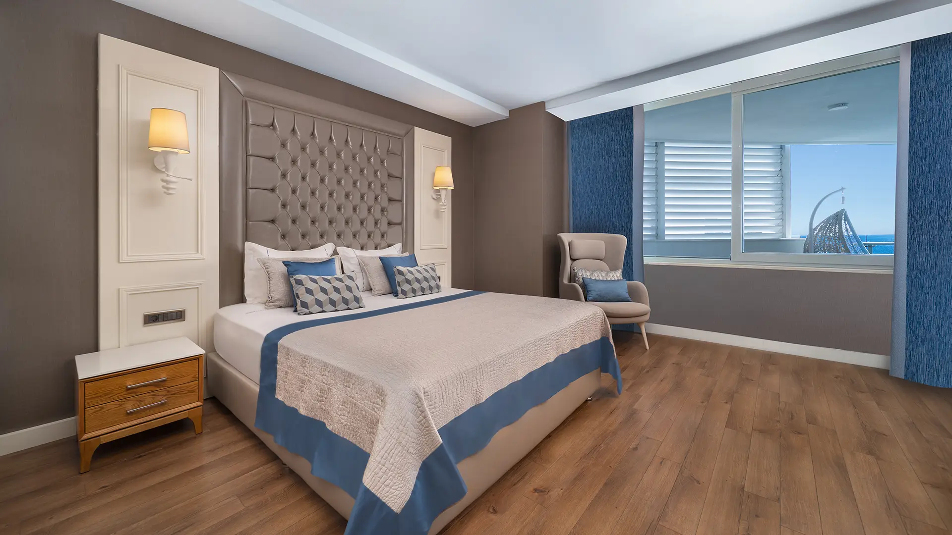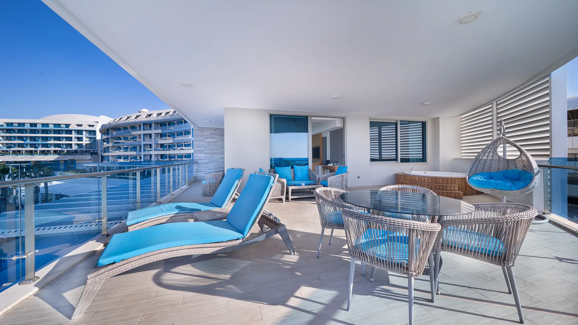 Наши номера Superior Suite Exclusive с безупречным дизайном и со вкусом обставлены, площадью 100 м² и предлагают уникальные привилегии для больших семей и компаний друзей, с двумя спальнями и гостиной. Подняв ваш отдых на новый уровень, в нашем номере есть большая зона отдыха в гостиной, а также стильный обеденный стол и тщательно продуманная барная секция. На балконе, с которого открывается уникальный вид на Средиземное море, есть джакузи, где можно приятно провести время, зона отдыха и шезлонги, чтобы вы могли наслаждаться солнцем, не выходя из своей комнаты. В главной спальне продумана каждая деталь, которая может вам понадобиться, а в ванной комнате установлена